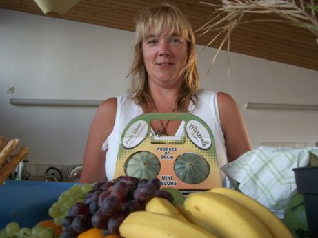 Karen proudly displays her melons!